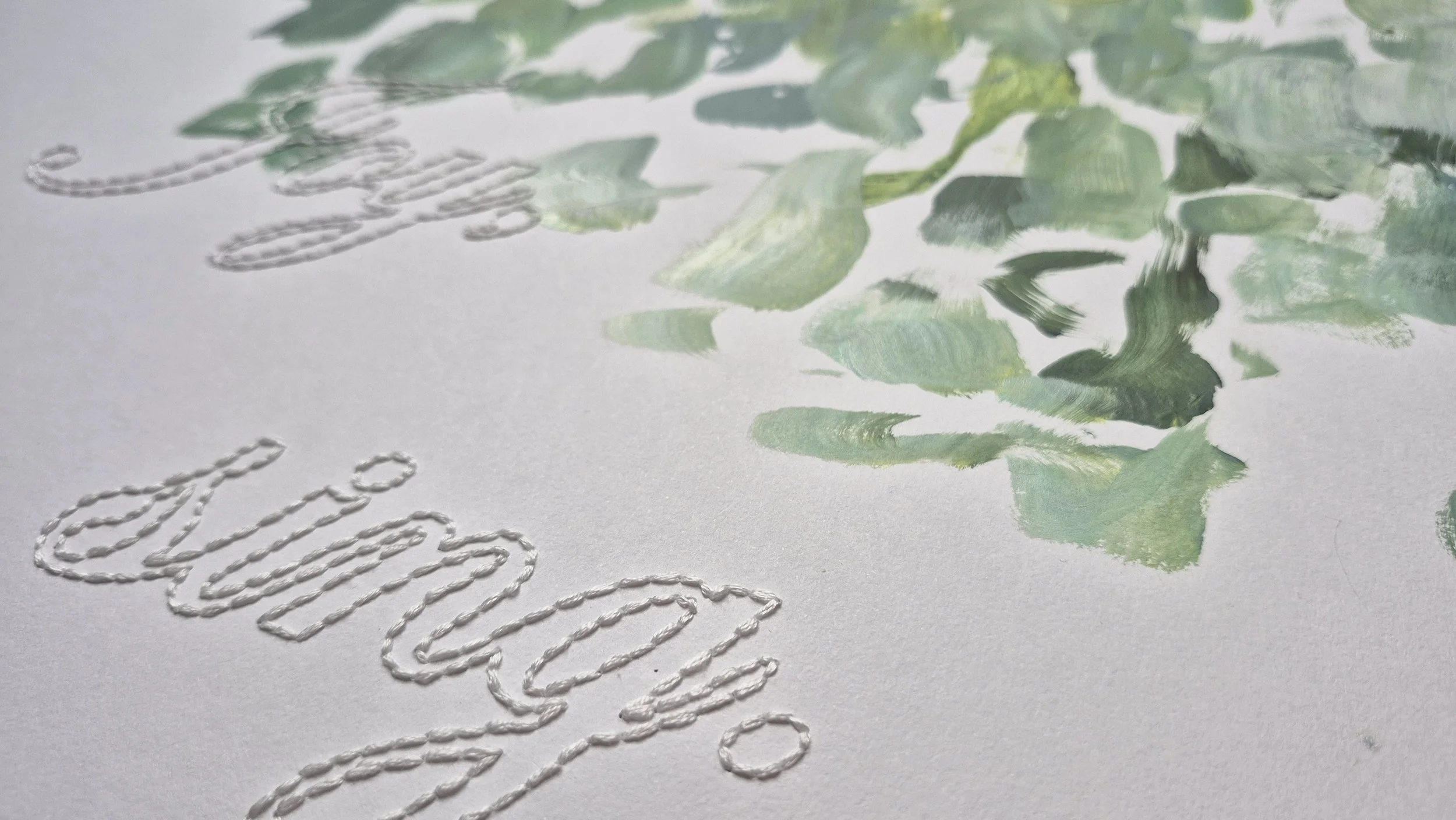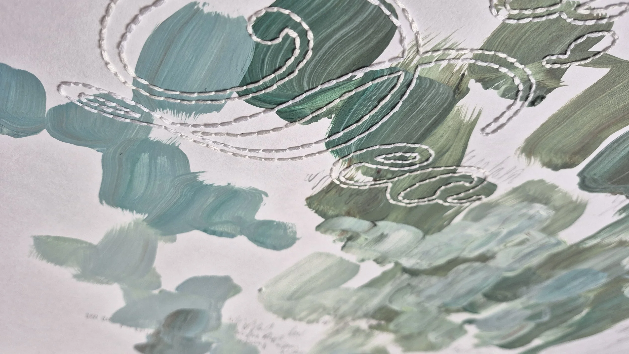 These two works were painted during rehearsals in preparation for A Winter’s Night for LBCCO’s 37th Season. As I follow the movement, consider the expansion of the lungs from which these sounds pour out, and what is the breadth, and length, and depth, and height of this sound. The sound guided the marks. Then, in the stillness of the studio, inspired by their power, I stitched these words which were sung and spoken during the rehearsals. There is a meter created through the hand embroidery—the pushing of the needle, and the pulling of the thread, like a rhythm, a cadence, of breath, of meter. There is power that is harnessed in these words. power.