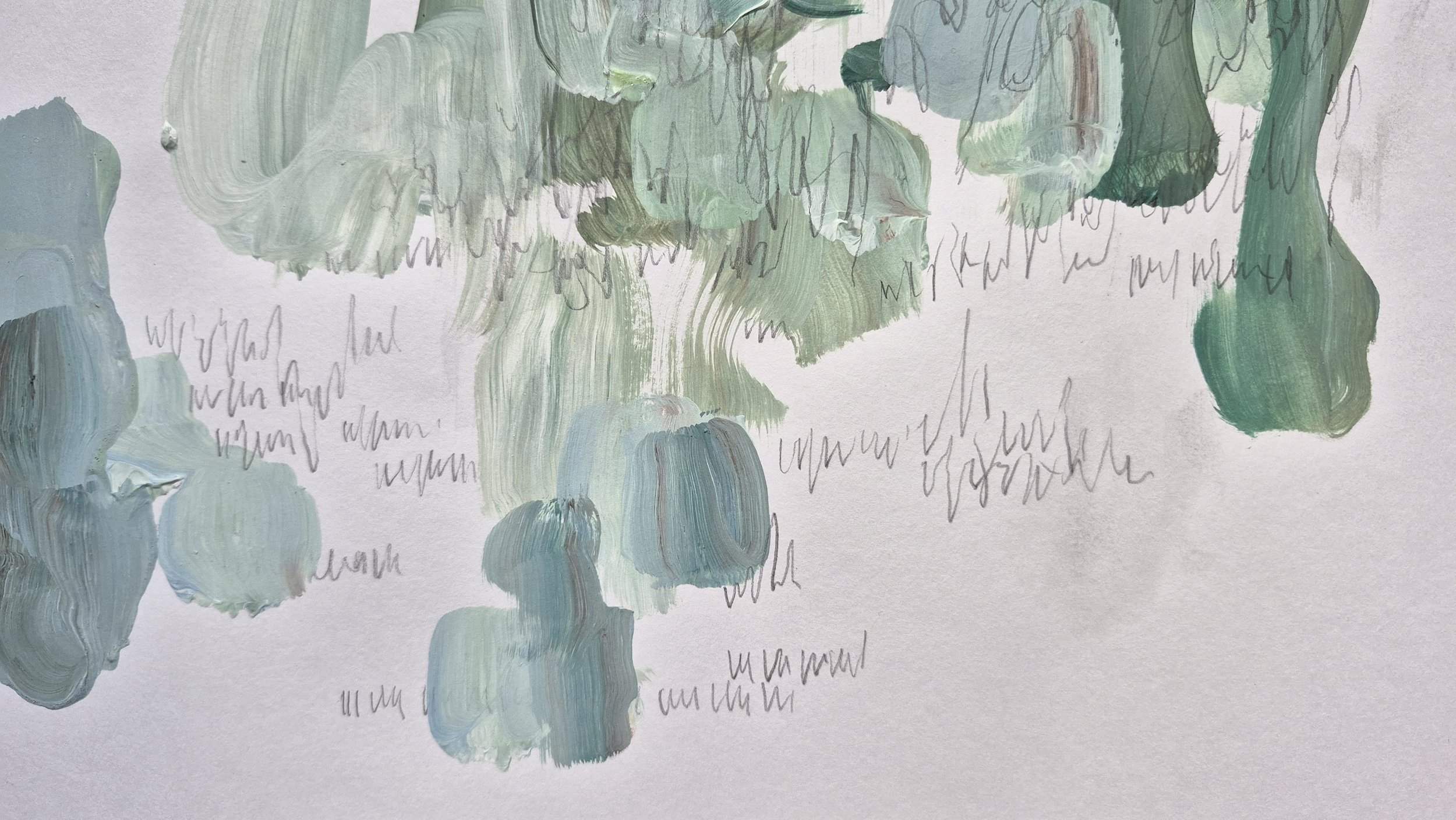 This piece was created while studying the movement of Personent Hodie. The Latin word "ideo" translates to "therefore". I was drawn to the manner in which ideo is sung repeatedly and prolonged while layering upon itself. The way ideo is sung felt like a kind of prolonged extension that so perfectly describes the word therefore, echoing the way that therefore extends a thought. The graphite scribbling is a visual echo of Ideo, that rang through the church.