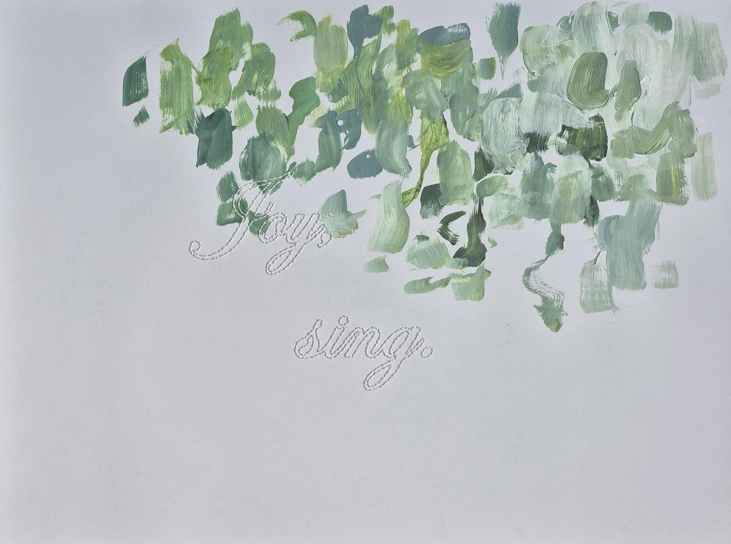 Joy, sing., 2025. Acrylic, graphite, and hand embroidery on paper, 18 x 24”. (View process here)