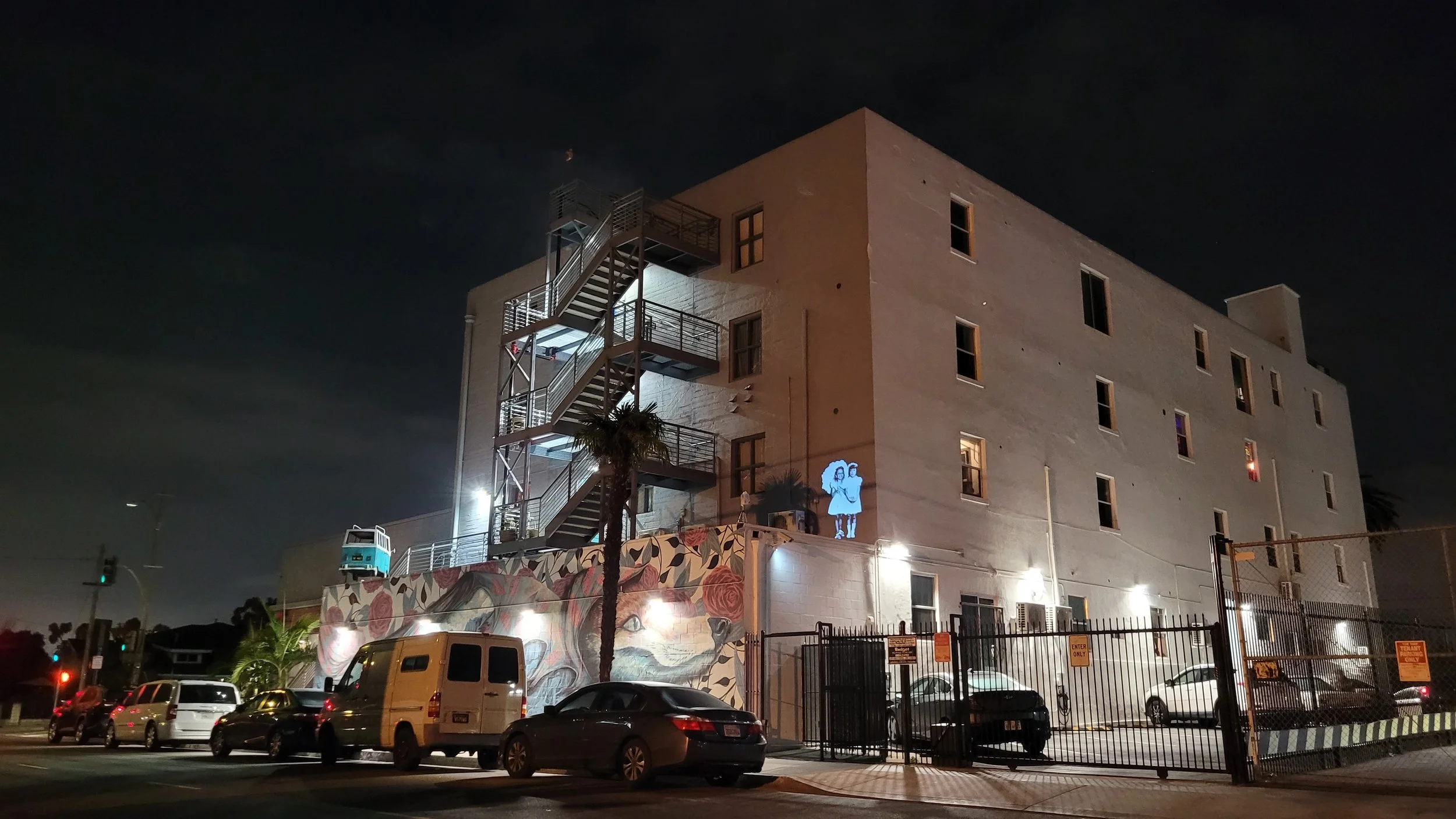 It Came as a Joyous Daybreak, 2023. Light projection facing Martin Luther King Jr. Avenue on the façade of The Vault Warehouse, Long Beach, CA. 106”H x 54”L