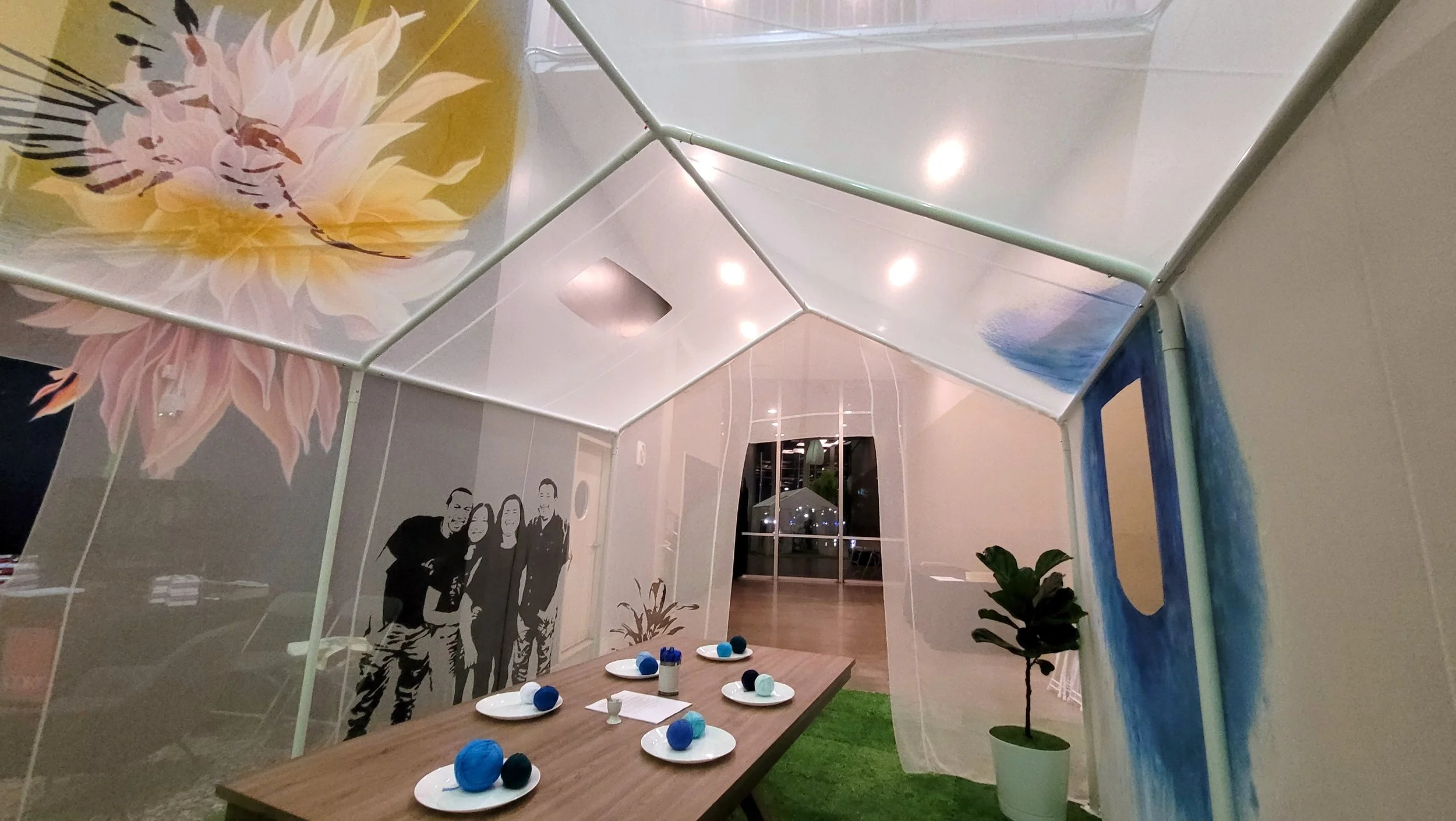Guests are invited to consider the elements, feelings, and memories associated with the ideal home, and then to encapsulate these notions into one single word, which is then hand-stitched directly upon the home. As the home travels from city to city, it will continue gathering the words that will strengthen its structure, both figuratively and physically.