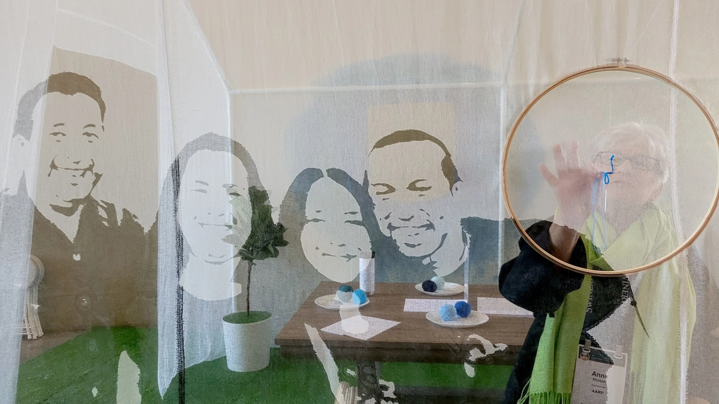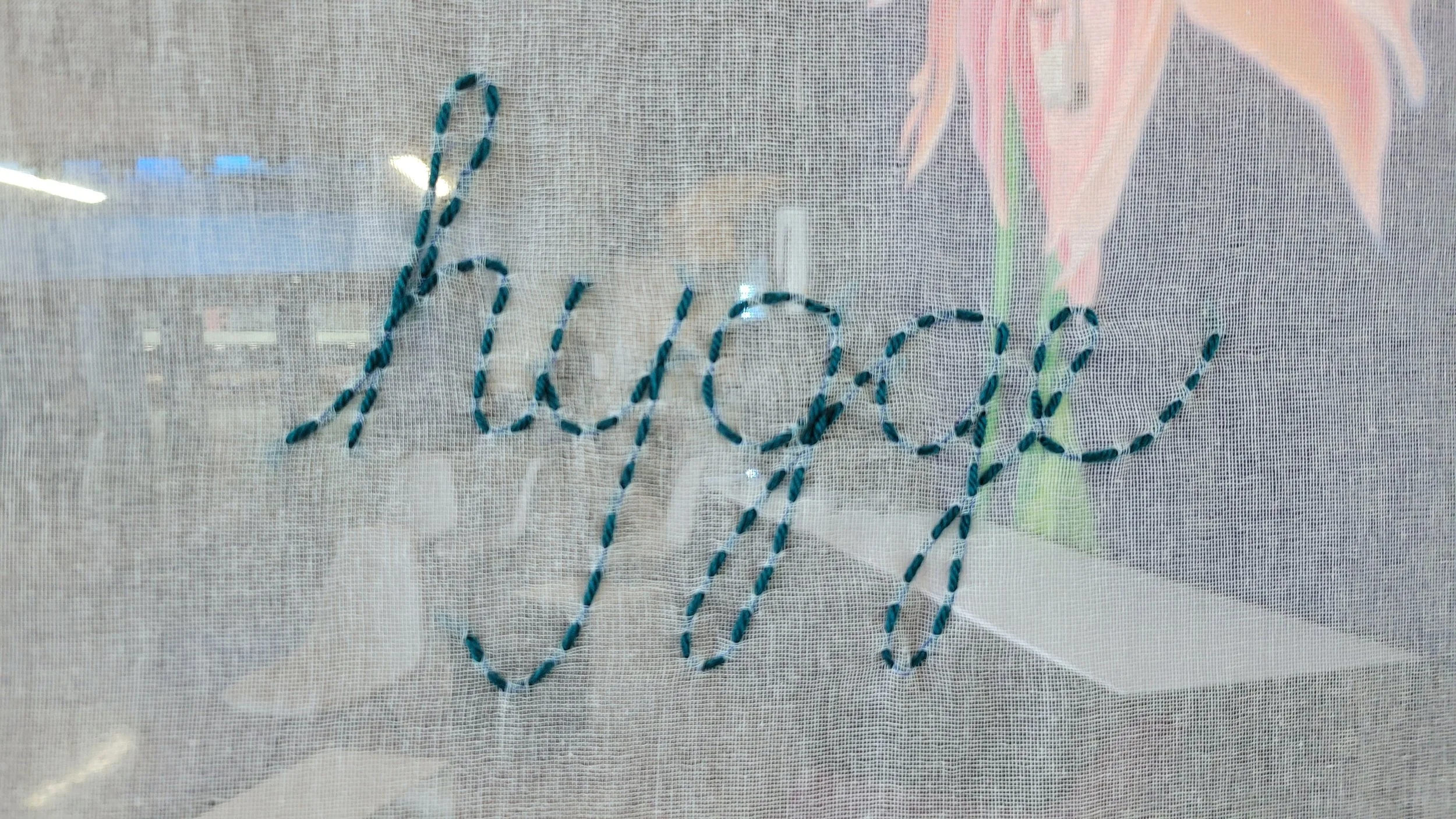 Peace be to this House calls for collective action, inviting guests to each contribute a single word that encapsulates their personal feelings and/or memories associated with the ideal home. With the hand-stitched, textual contributions of each unique hand, the hopes for our dwelling places take on tactile form as words of refuge, comfort, and good will dapple the walls.