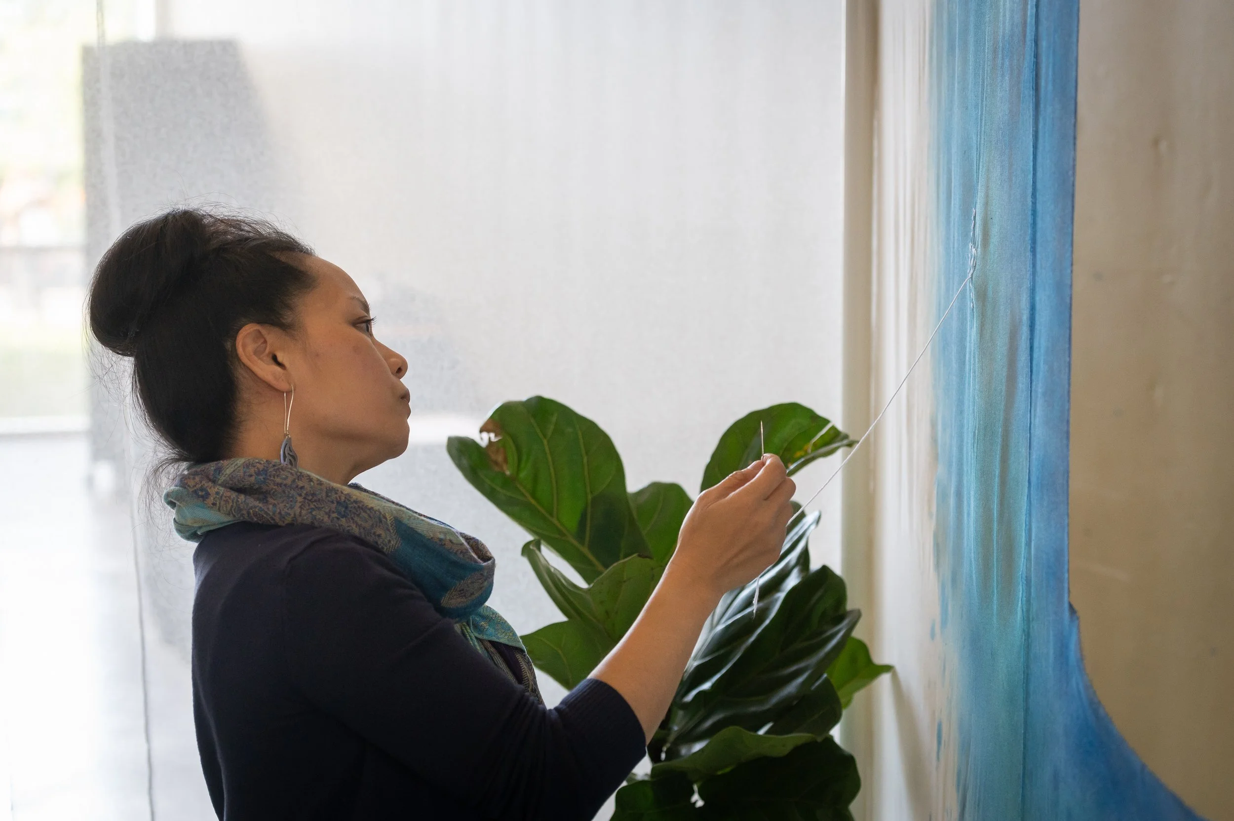 While the translucency of the cloth allows light to penetrate all corners of the home, from both within and without, a dove hovers overhead as a bearer of an enduring peace that covers the families and the children who dwell therein. The home teams with life, grounded upon a foundation of growth as living plants populate the interior. It is washed with California’s state colors—blue, which represents our brilliant blue skies, and gold that signifies the California gold rush, which attracted thousands, contributing to the diversity of our culturally rich state.