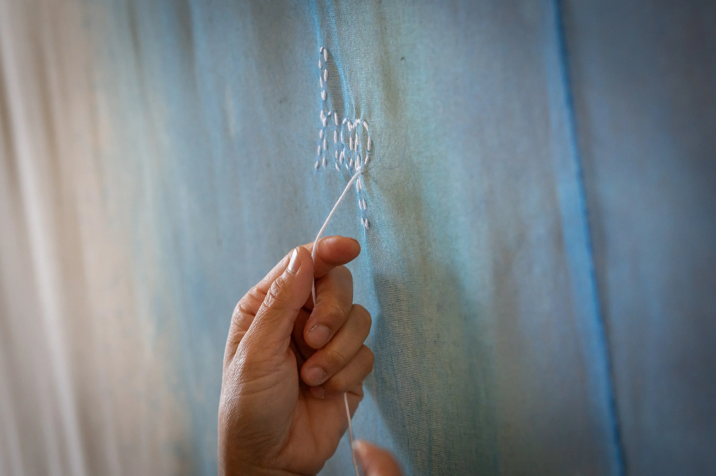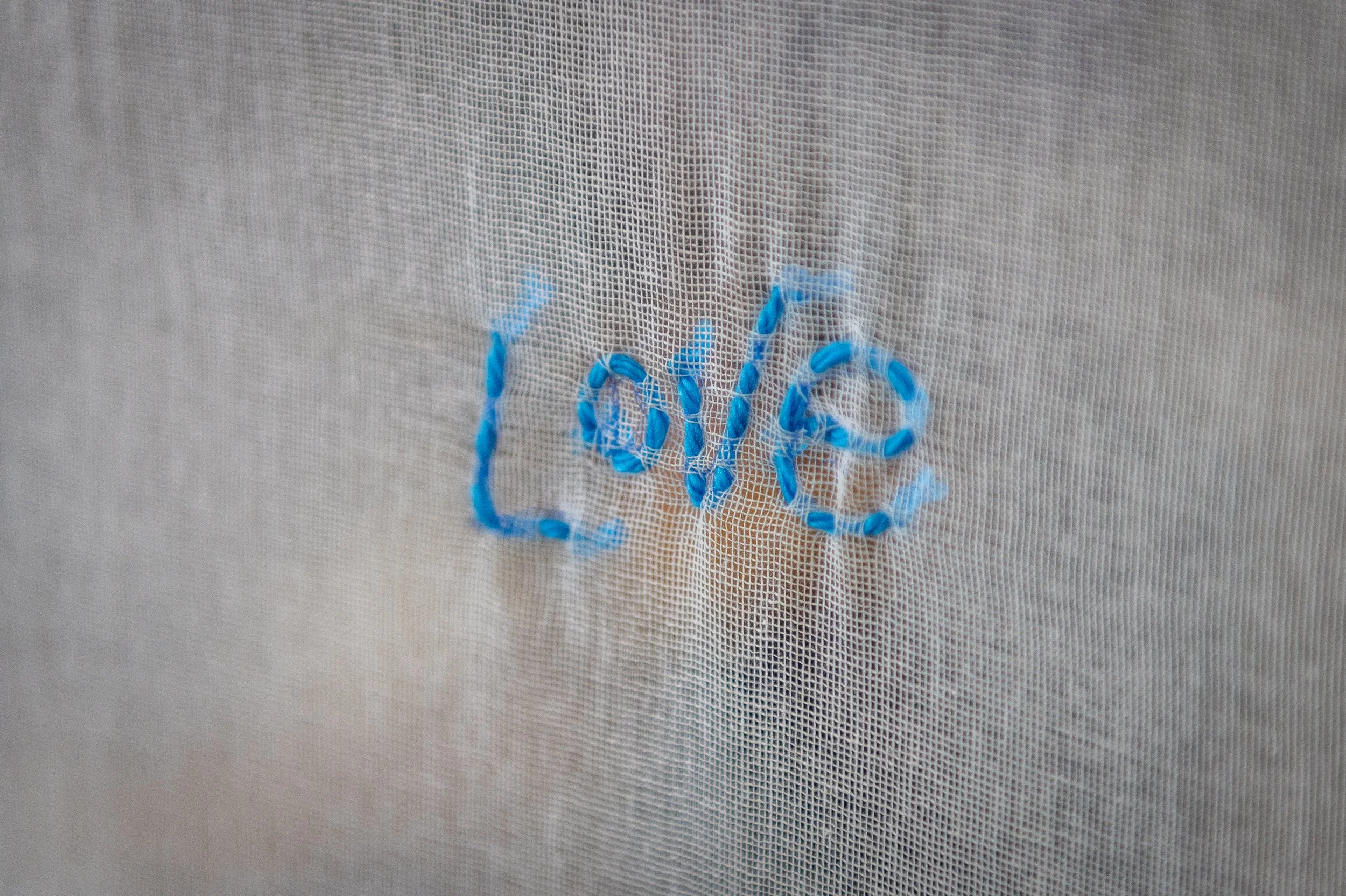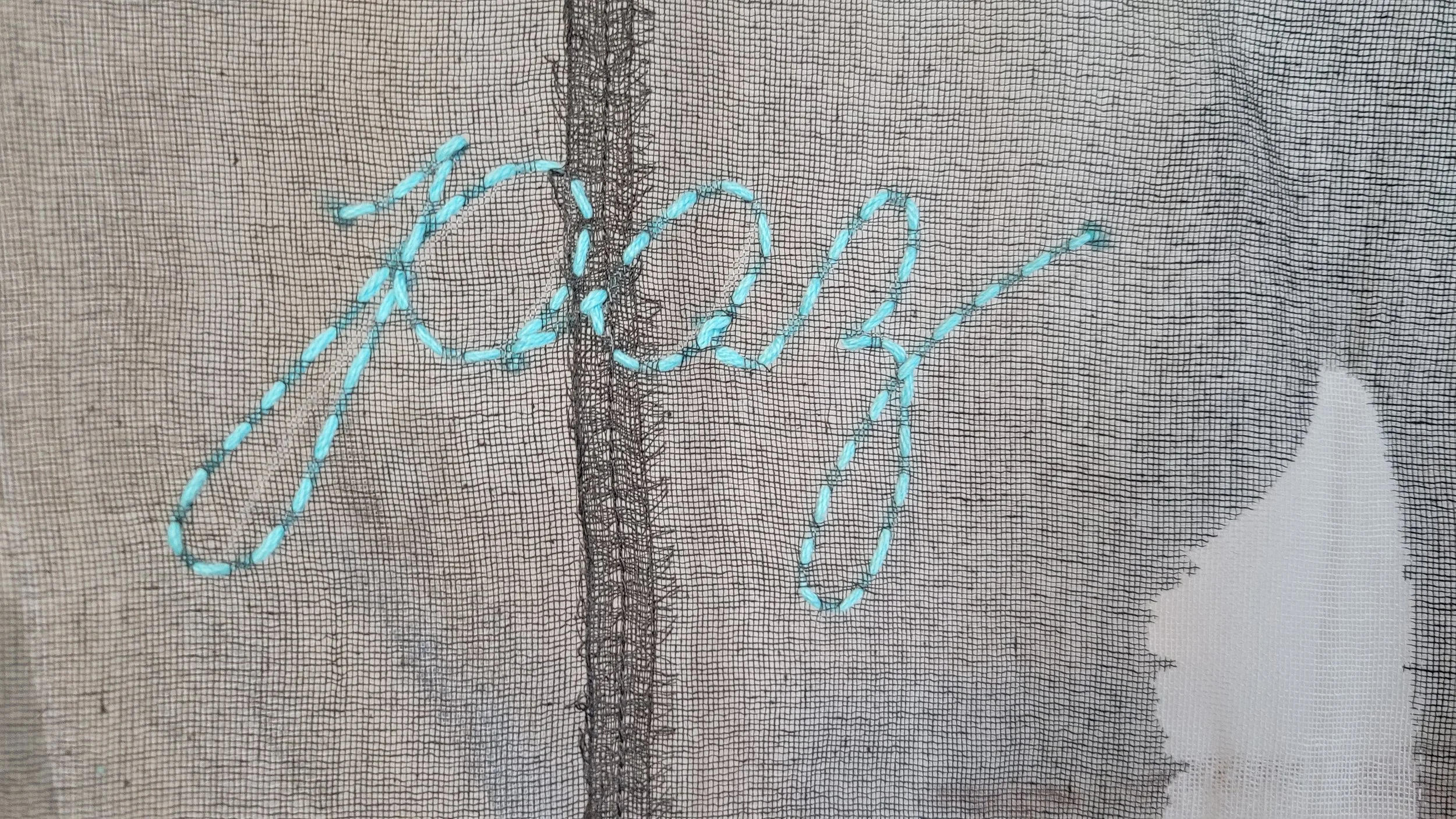 The materials used in this piece are those that might be found in the home, perhaps having been traditionally used for generations. Hand-stitching is incorporated as a patient act of mending and healing, while cheesecloth is commonly used to provide nourishment, symbolizing the ways that love that can be expressed through the generous act of hospitality. The cheesecloth also makes tactile the fragile nature of peace within the home.