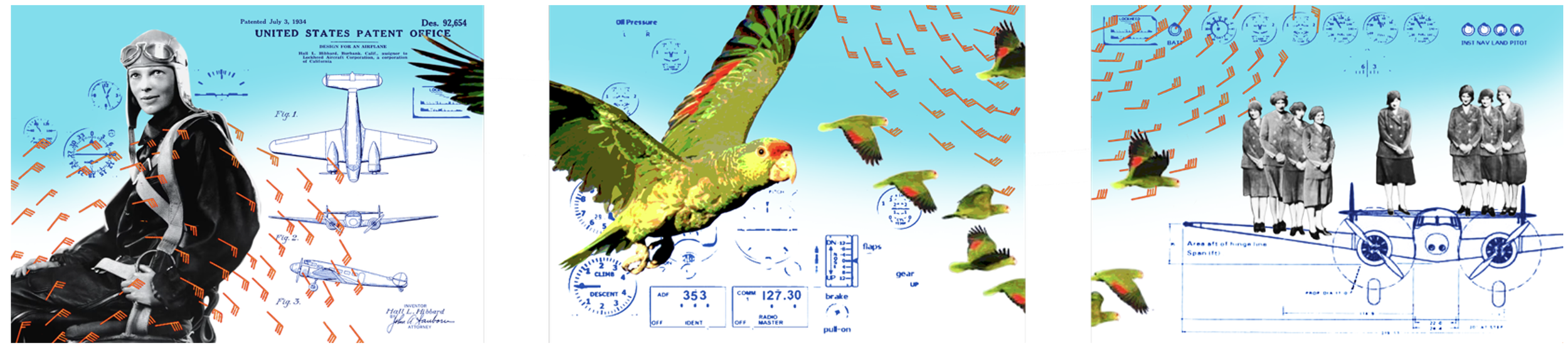 Also recognizing the astounding human intelligence that has allowed us to create these carrier birds to transport us to distance through space and time, a flock of red-crowned parrots take flight as the inspiration for this inventive feat. The Tri-cities’ renowned parrots are ubiquitous to southern California and illustrate an upward movement that further describes aviation and social progress as spearheaded by these celebrated women in history. They soar alongside our flight leaders through clustering wind barbs—these symbols that are used by meteorologists to signify wind speed and wind direction on weather maps, which allow pilots to safely plan efficient flights. As a foundation for innovation and the rigorous labor that serves the vision for progress, this monumental time in aviation advancement is built upon the blue prints of the Lockheed’s Electra 10E, its flight instruments and gauges guiding these pioneers and the ones to come.